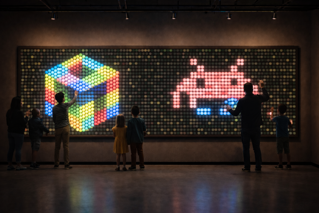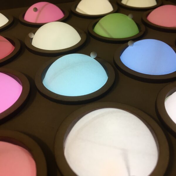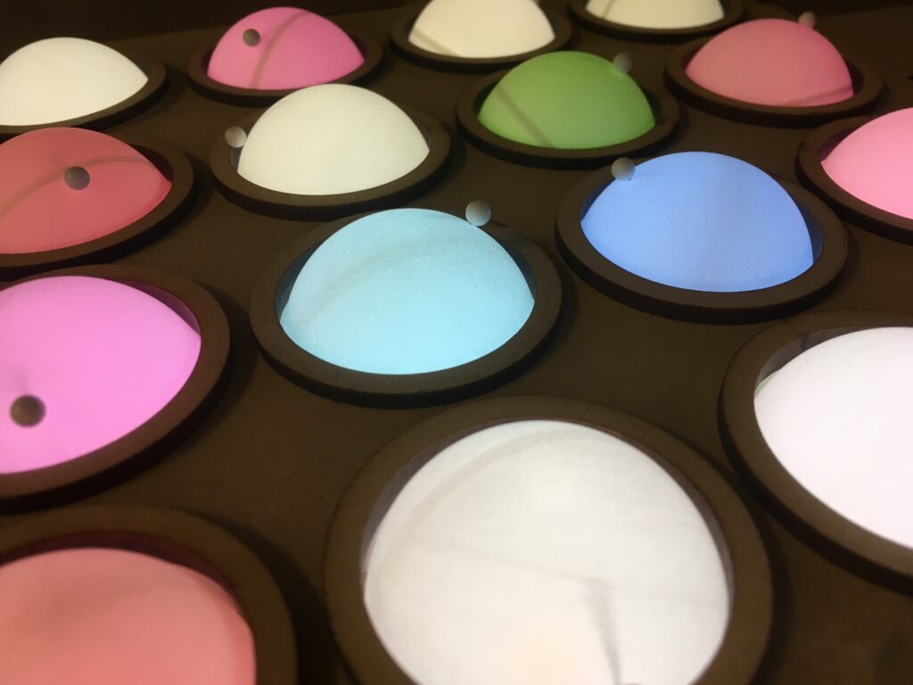 Koloropong is a low-tech interactive light installation inspired by vintage toys such as the Lite-Brite of the 1980s. It proposes a simple and tactile way to create a colorful luminous display without screens, computers, or digital interfaces. The installation is composed of thousands of ping-pong balls, each acting as a physical pixel. Each ball changes color according to its orientation, and visitors modify the image by manually rotating them.Interaction is immediate, intuitive, and embodied. Turning a single ball already produces a visual response, its a modest yet deeply satisfying gesture. This elementary action invites repetition, attention, and care.